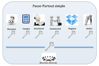 Dans un organigramme avec passe général, chacune des clés ouvre un accès donné. Il existe, en plus, une clé capable d’ouvrir tous les accès. Il est également possible de coupler l’ouverture centrale et le passe général.