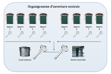 Un organigramme de clés est un système de hiérarchisation de clés qui peut ouvrir plusieurs accès ou portes de plusieurs immeubles, habitations… (garage, bureau, maison…)